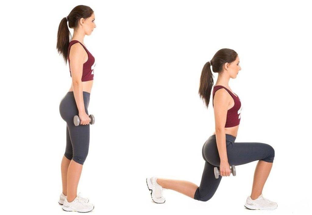 Новичкам лучше не использовать гантели или обойтись легким весом. Исходное положение: спина прямая, руки вытянуты вперед перед грудью. При каждом шаге руки опускаются вниз. Одна нога выдвигается вперед и сгибается в колене, следите, чтобы колено не выступало за носок. Нужно присесть максимально низко, чтобы в мышцах чувствовалось напряжение. Ноги можно чередовать на месте или передвигаться большими шагами по помещению. Чем шире шаг, тем больше эффект от выполнения упражнения.
