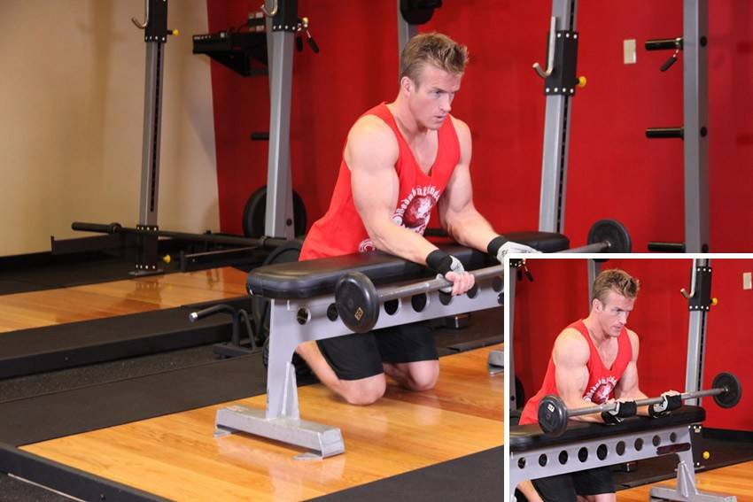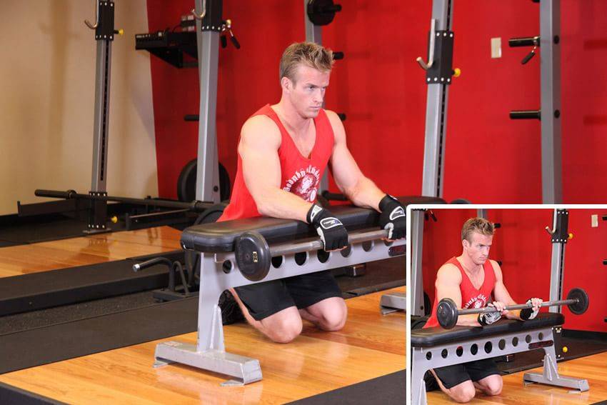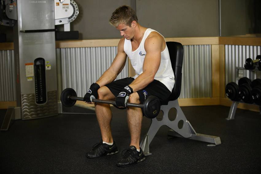 Сгибание запястий со штангой сидя на скамье (ладонями вниз)