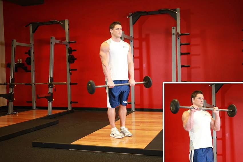 В положении сидя или стоя, возьмитесь за штангу прямым хватом, расставив руки на ширине плеч. Опустите локти книзу, удерживая штангу на уровне ключиц. Ноги стоят параллельно друг другу. Выжмите штангу, полностью распрямив руки в локтях. Медленно опустите штангу приблизительно до уровня носа и мощно верните в исходное положение