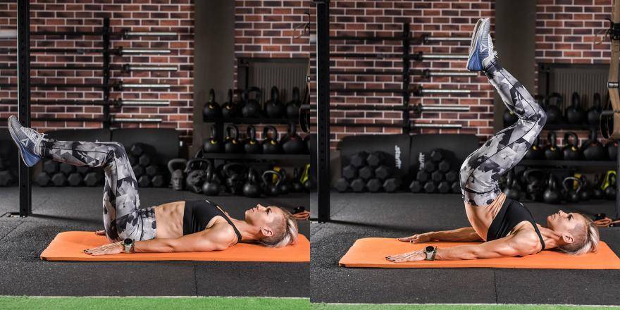 - Поднятие ног с пульсациями – лягте на пол, руки положите под ягодицы, ноги прямые. Поднимите ноги вверх так, чтобы они образовали прямой угол. Из этого положения, за счет усилий ягодиц и пресса, сделайте несколько ритмичных движений ногами вверх. Затем, вернитесь в исходное положение;