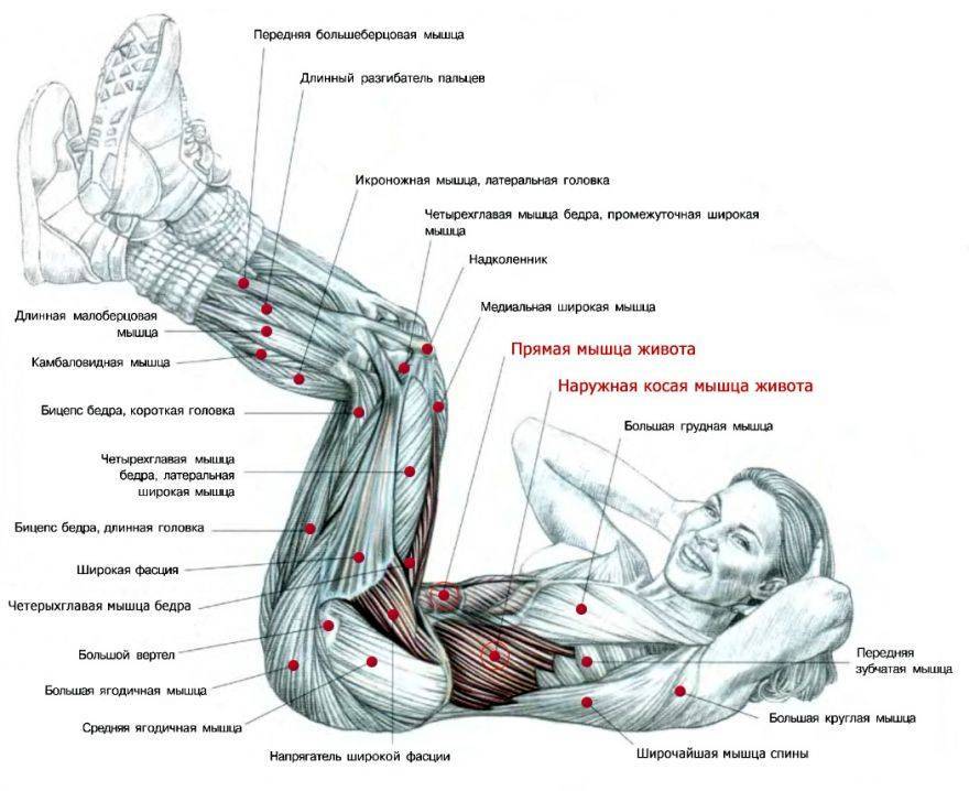 Несмотря на то, что мышцы пресса достаточно небольшие по площади, каждая группа (всего основных групп – 3) нуждается в отдельной проработке. Упражнение полноценно нагружает все три: прямые, внутренние и наружные косые, тем самым являясь достаточно эффективным и результативным. Благодаря особенностям техники выполнения, значительную работу приходится выполнять косым мышцам – именно они прорабатываются тяжелее всего.