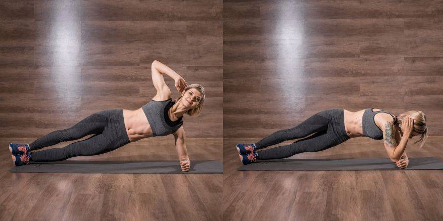 Для увеличения нагрузки на определенные части пресса возможны некоторые варианты планки. Можно делать упор на одной руке с разворотом туловища вбок, можно с подтягиванием ног к одной из рук и т. д.