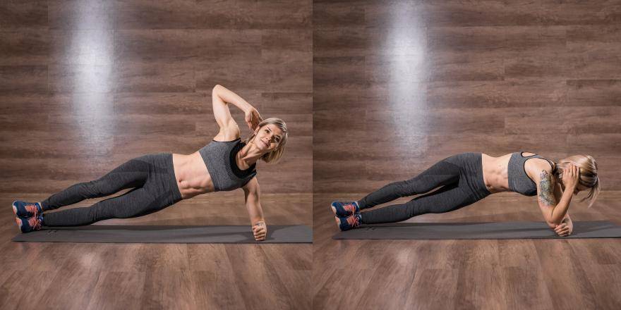 - Стоя в боковой планке, вытянуть свободную руку за голову. Подтягивать колено к груди, а локоть к колену. По 10 раз на каждую сторону.