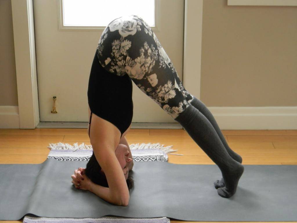 - Макушкой головы упираются в гимнастический коврик, разложенный на полу.