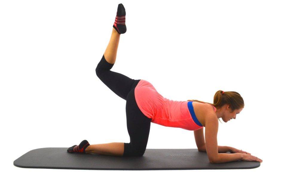 Исходное положение похоже на «позу ребенка». Вся работа производится на полу, необходимо сделать упор на локтях и держать их под плечами. Ладони поворачиваются внутрь, а колени располагаются под бедрами, прижимаясь к ним. Поднятие ног осуществляется вверх поочередно (по 10-15 раз), чтобы они оставались немного согнутыми в коленях. В ходе выполнения напрягаются бедренные и ягодичные мышцы. Следите за тем, чтобы во время принятия положения верхняя и нижняя части туловища располагались на одной линии и были параллельны полу.