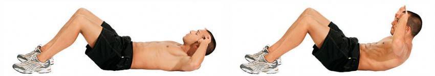 - Скручивание. Тренируется верх прямой мышцы. Выполняется лежа на спине, руки на груди скрещены, кисти рук на плечах. Сгибая, поднимать верх корпуса до касания локтями коленей. Лечь, выпрямляя туловище. И так 3 сета по 20 повторов.
