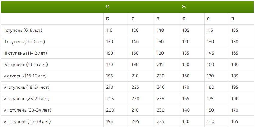 Если речь идёт о взрослых спортсменах, то для них нормативы отличаются в зависимости от возраста. Посмотрите данные в таблице, где Б – бронза, С – серебро, З – золото.