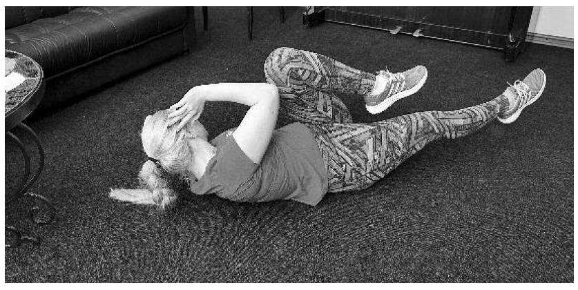 Это упражнение ориентировано на физически подготовленных занимающихся, так как требует большой выносливости от мышц брюшного пресса и хорошей координации. В отличие от предыдущих упражнений для мышц брюшного пресса при выполнении этого упражнения дыхание почти отсутствует (1 выдох на 4–6 движений), что само по себе является сложным условием. В то же время прекрасно включаются косые мышцы живота (талия). По сути, это упражнение относится к силовой аэробике, так как эффект достигается только при большом количестве повторов выполняемых движений в одном ритме. И.П. лежа на полу на спине. Ладони прижаты к ушам. Поочередное касание локтями коленей крест-накрест. При этом колено согнутой ноги необходимо как можно ближе прижимать к животу, а вторую ногу одновременно выпрямлять вдоль пола, но не касаясь его. Выполнять 10–20 повторений на каждую сторону