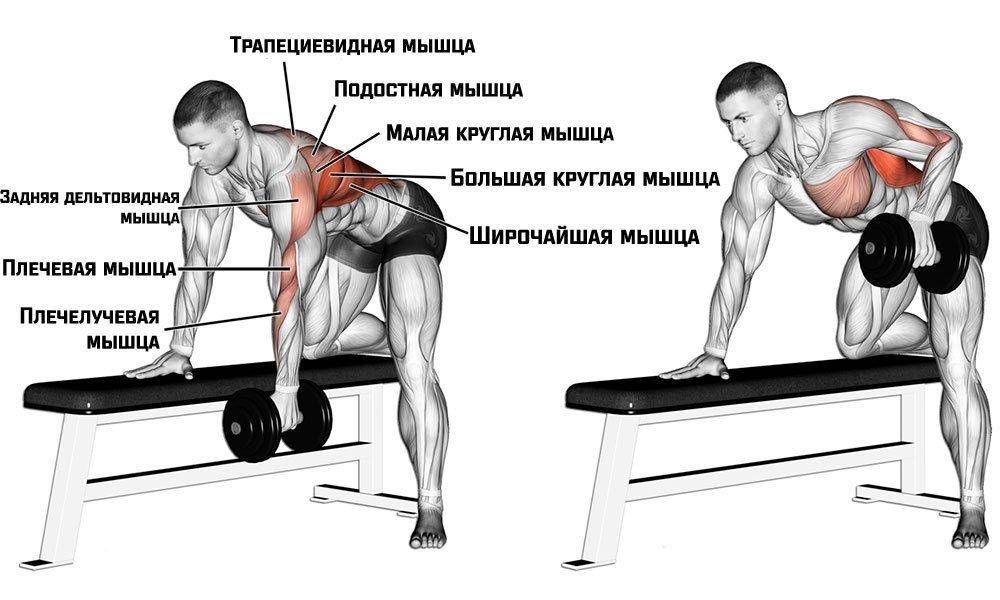 Второй вариант выполняется следующим образом: обе ноги стоять на полу, но левая располагается впереди правой и согнута в колене. После нужно упереться левой рукой в скамью и наклонить корпус. Данные упражнения позволяет прокачать нижний крайширочайших мышц, а так же снизить нагрузку на позвоночник и увеличить амплитуду движения.