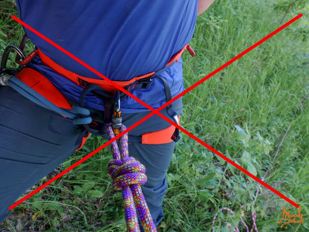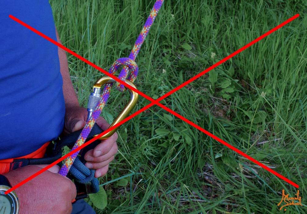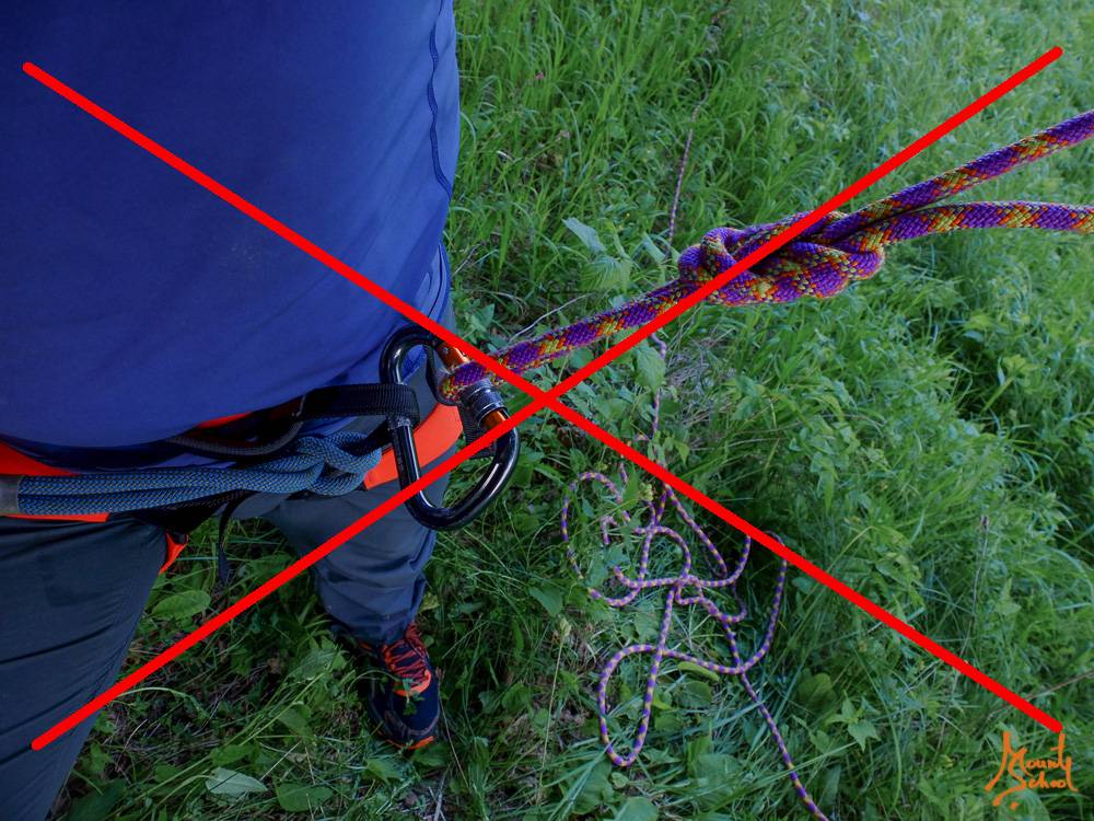 Важно контролировать положение свободного конца веревки — он не должен соприкасаться с муфтой и/или защелкой карабина. Трение веревки по муфте может привести к ее разблокировке, открытию защелки карабина и потере страховки