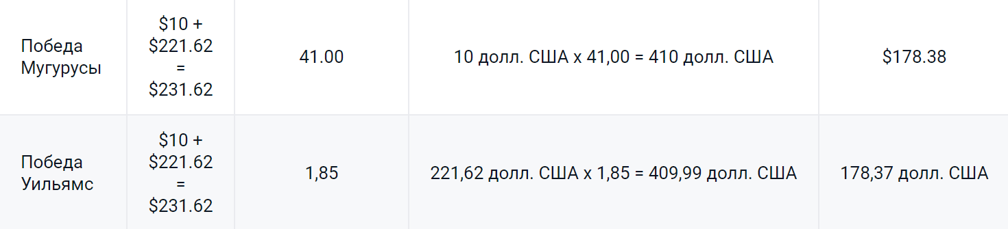 Но букмекеры, формировавшие линию перед начало соревнований, не взяли в учет потенциал молодой испанки, и предложили на ее победу в турнире высокий коэффициент 41,00. Дальше рассмотрим пример, при котором игрок прочитал данную ситуацию, и перед началом соревнований, сделал ставку на итоговую победу Мугурусы размером 10 долларов.