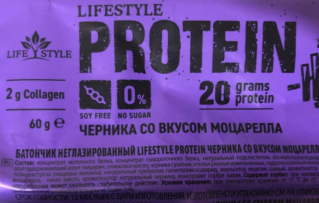 Тот же производитель, что и у рассмотренного ранее батончика Protein PRO, но на этот раз экземпляр без глазури (глазурь = сахар или его заменители, а значит, углеводы). Смотрим в состав, и на первом месте – концентрат молочного белка, а на втором – концентрат сывороточного белка. Это видно и по внешним признакам. Далее уже видим подсластители, эмульгаторы и ароматизаторы. К слову, вкус на этикетке указан «черника со вкусом моцареллы», но по своим ощущениям скажем, что он достаточно «химозный». А сам батончик с трудом можно прожевать, уж больно он плотный. Возможно, стоит поискать этот же батончик с другим вкусом. И еще занимательно то, что у одного производителя два таких разных по составу продукта. Хотя цель вроде одна.