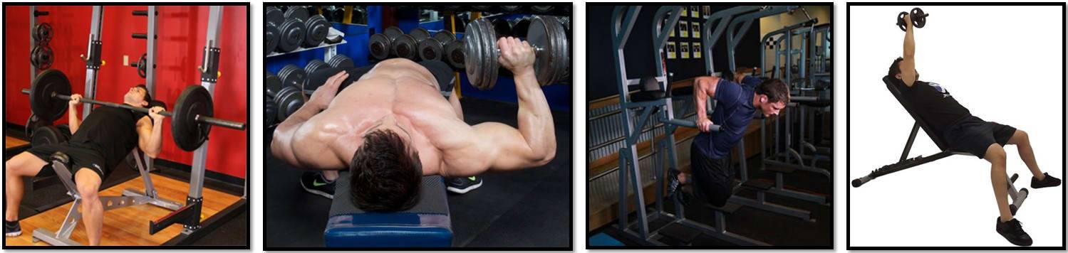 - жим штанги под углом вверх, 4 сета, 8-12 повторений;