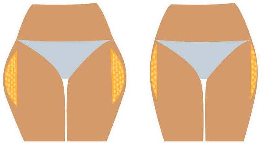 Локализация подкожного жира на женском теле зависит от типа телосложения. При типе фигуры «груша» жировые запасы откладываются преимущественно на ногах и ягодицах, образуя ушки или, как их еще называют, галифе на бедрах. При этом вес тела может быть нормальным или даже низким за счет узких костей и слабо развитых мышц.