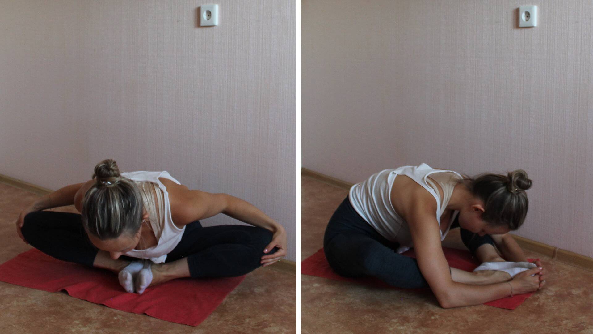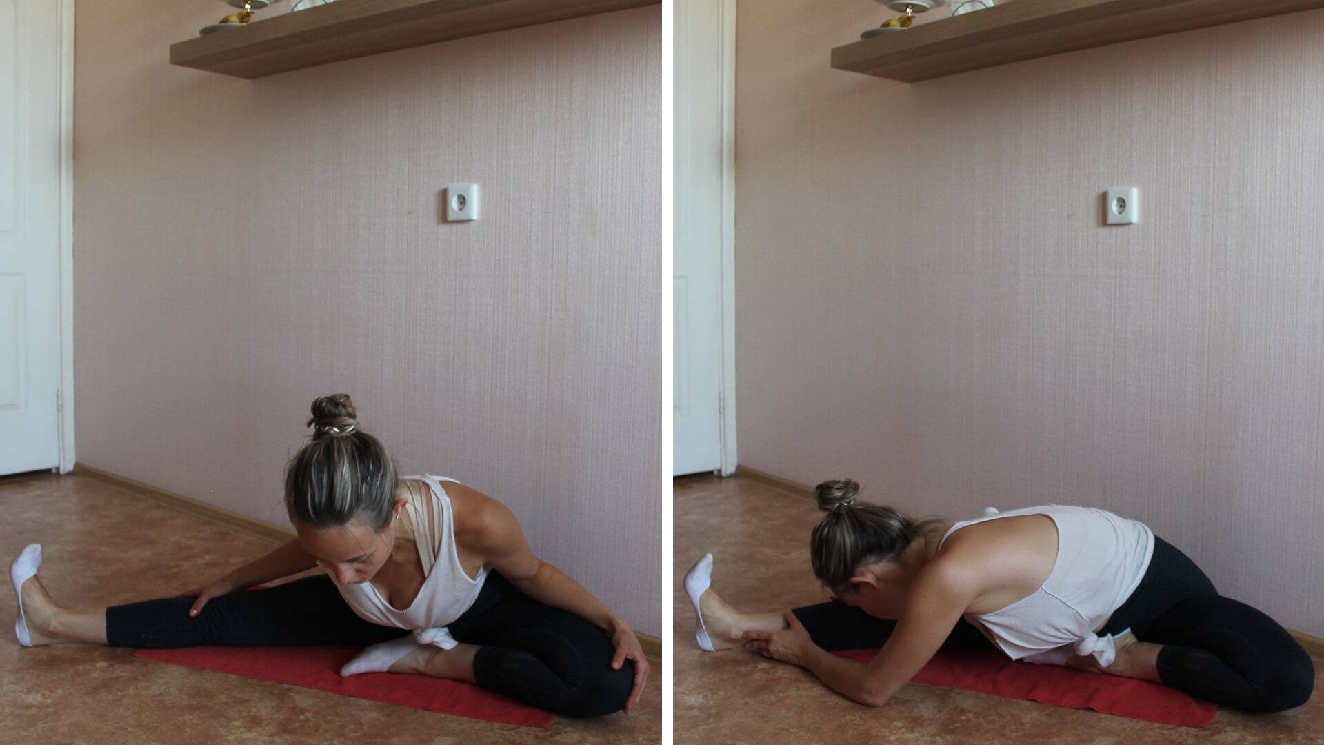 - Сядьте на пол, протяните ноги вперед и в стороны. Поднимите руки вверх, и нагибайтесь к левой ноге, пытайтесь коснуться ее грудью. Повторите на правую ногу.