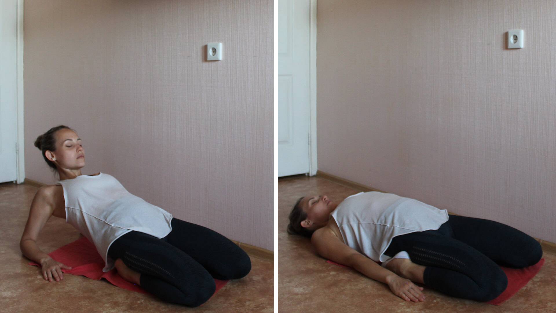 - Согнув ноги под ягодицы, с сохранением ровной спины, опуститесь назад в горизонтальное положение.