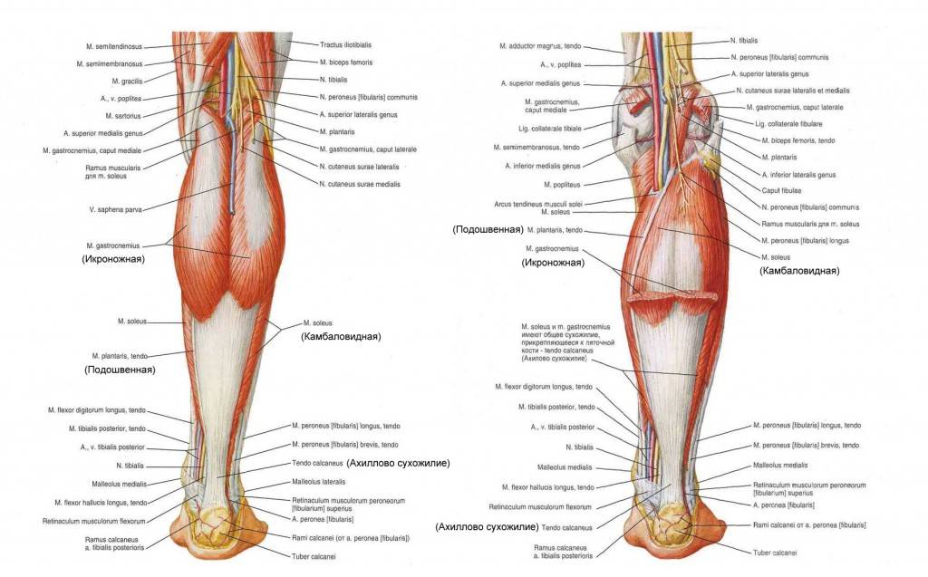 Икроножная мышца. Двуглавый мускул начинается у бедренной кости, крепится к ахиллову сухожилию на пятке. Состоит из 2-х секций, расположенных внутри и снаружи конечности. Оба участка считаются мощным мышечным телом. Расположенная ближе к середине медиальная головка развита лучше, чем латеральная.