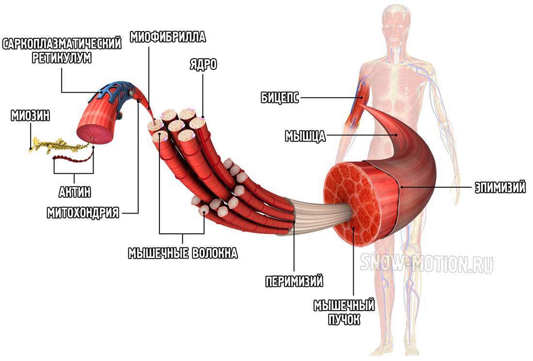 Оболочка мышечных волокон покрыта миофибриллами. От их количества зависит скорость сокращения мышц и их сила. Тренировки приводят к увеличению толщины и количества миофибрилл. При росте их в 2 раза сила мышцы возрастает в 3 раза.