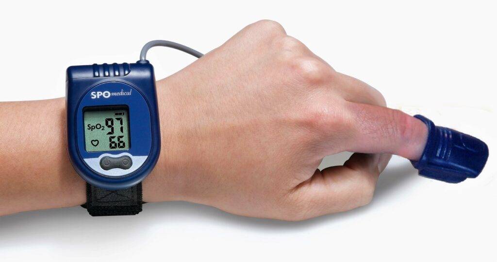 Вне стационара и в палатах интенсивной терапии для мониторинга (постоянного контроля) за уровнем кислорода в крови используется пульсоксиметрия. Суть этого метода состоит в том, что гемоглобин поглощает свет в зависимости от его насыщенности кислородом. Прибор для измерений (пульсоксиметр) представляет собой датчик в виде своеобразной прищепки, которая фиксируется на пальце или мочке уха, а также дисплей, показывающий сатурацию.