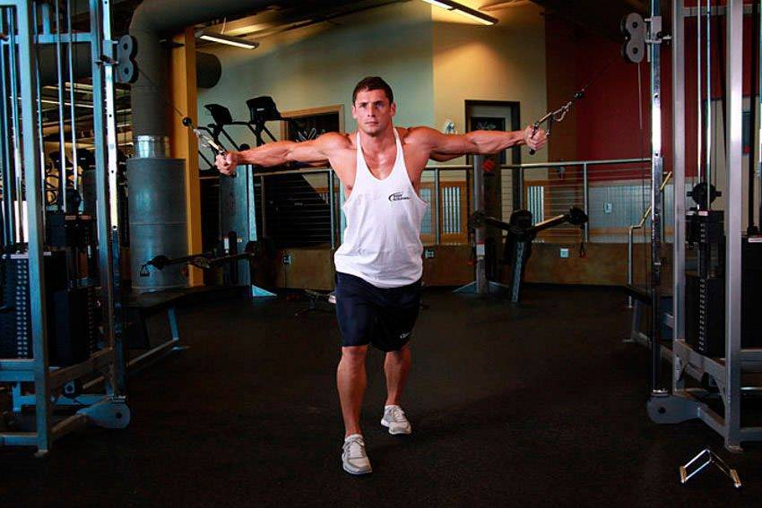 Техника: спортсмен разводит руки как в обычном разведении с гантелями, в одной плоскости по дугообразной траектории, и снова сводит их к груди