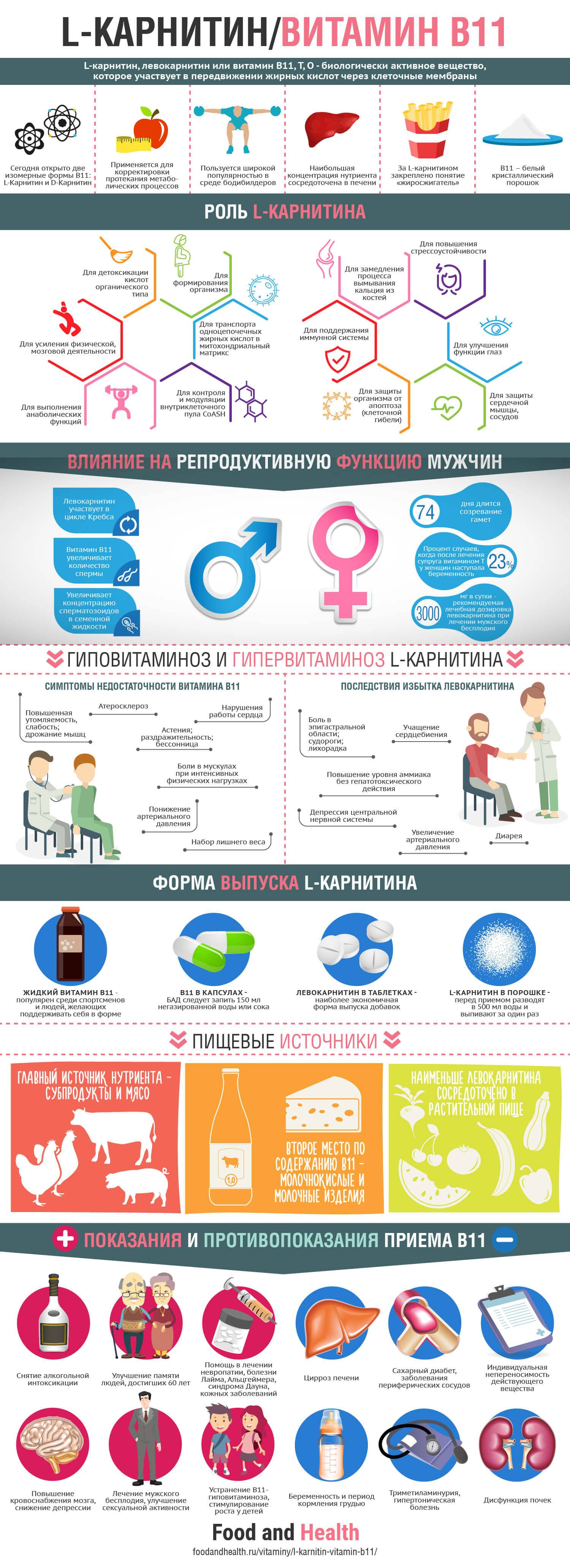 Учитывая тот факт, что витамин В11 стимулирует рост мышц, окисляет и выводит жиры из организма, способствуя похудению, продукты, богатые на полезное соединение всегда присутствует в меню атлетов и людей, желающих сбросить лишний вес. Наибольшее количество нутриента находится в субпродуктах и мясе. Второе место по содержанию «жиросжигающего фактора» принадлежит молочнокислым, молочным изделиям. Наименьшее количество левокарнитина сосредоточено в растительной пище. По этой причине, часто В11-гиповитаминозом страдают приверженцы строгой вегетарианской диеты.