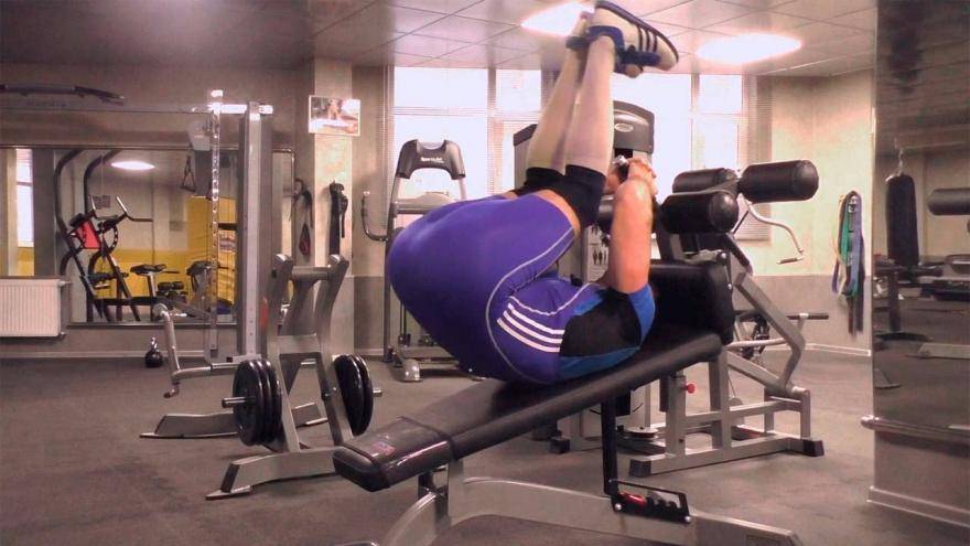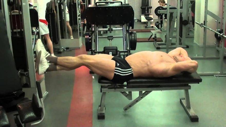 Сядьте на край скамейки. Вытяните прямые ноги вперед под углом 45 градусов, а руками держитесь за скамью. Статически напрягите пресс. Взгляд направьте вперед. Это ваша исходная позиция.