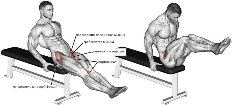 - синергисты — напрягатель широкой фасции бедра, гребенчатая, портняжная, длинная/короткая приводящие;