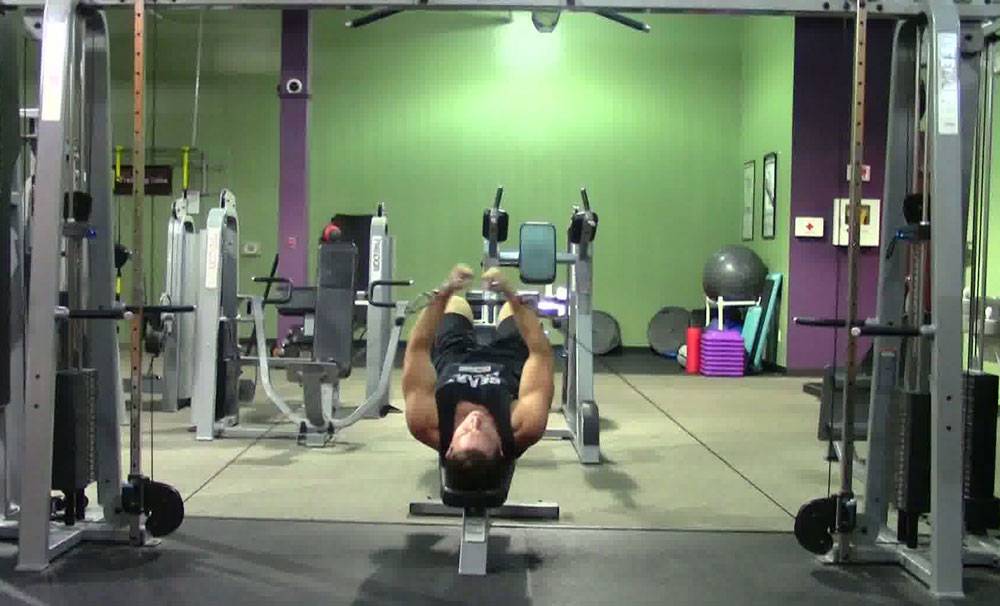 Таким образом, для проработки таргетируемой зоны следует подготовить штангу и опустить скамью так, чтобы голова оказалась ниже ног. Угол наклона подбирается опытным путем и зависит от силы мышц и общего состояния здоровья. В остальном техника стандартная: лечь на скамью, руки установить на грифе (прямой хват в замок), затем снять гриф и согнуть руки. Выжать штангу одним интенсивным движением вверх, а затем опустить к соскам. Во время выполнения следить, чтобы ноги крепко были прижаты к полу или фиксирующим упорам, локти двигались в одной плоскости, а ягодицы не отрывались от скамьи.