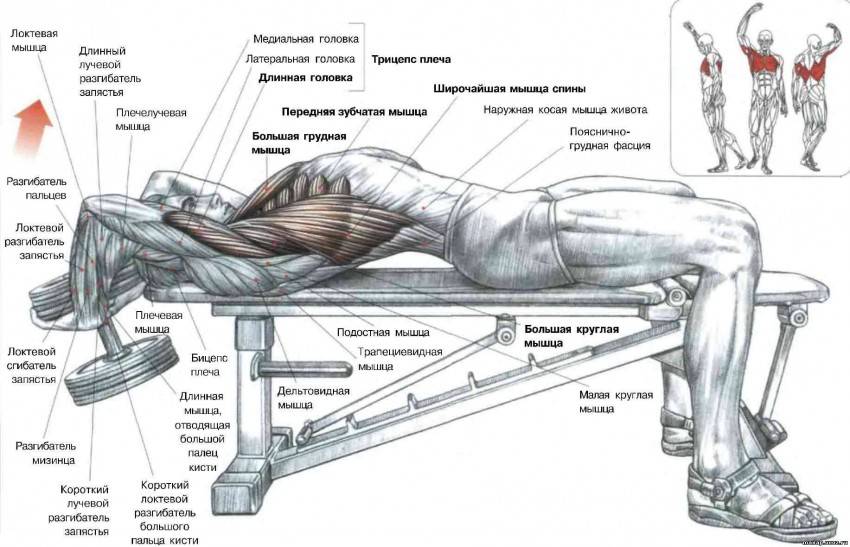 Важно, чтобы корпус находился в горизонтальном положении и был надежно зафиксирован. Потому рекомендуется делать это упражнение на спину с гантелями на скамье, где можно принять упор на руку и колено одновременно