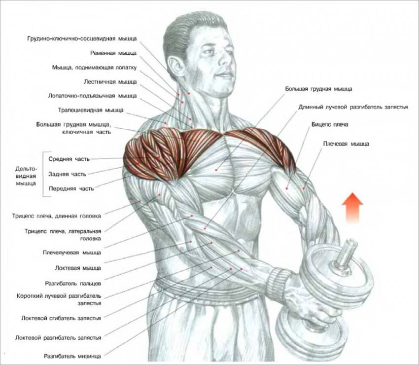 Тяга гантелей к подбородку. ИП – возьмите гантели обычным хватом, то есть, чтобы ладони были направлены вниз. Необходимо немного согнуть ноги в коленях и наклонить торс слегка вперед. Задача – медленно поднимайте гантели до уровня плеч. При этом локти необходимо направить вверх и они должны находиться выше кистей. После этого руки опустите и повторите все сначала.