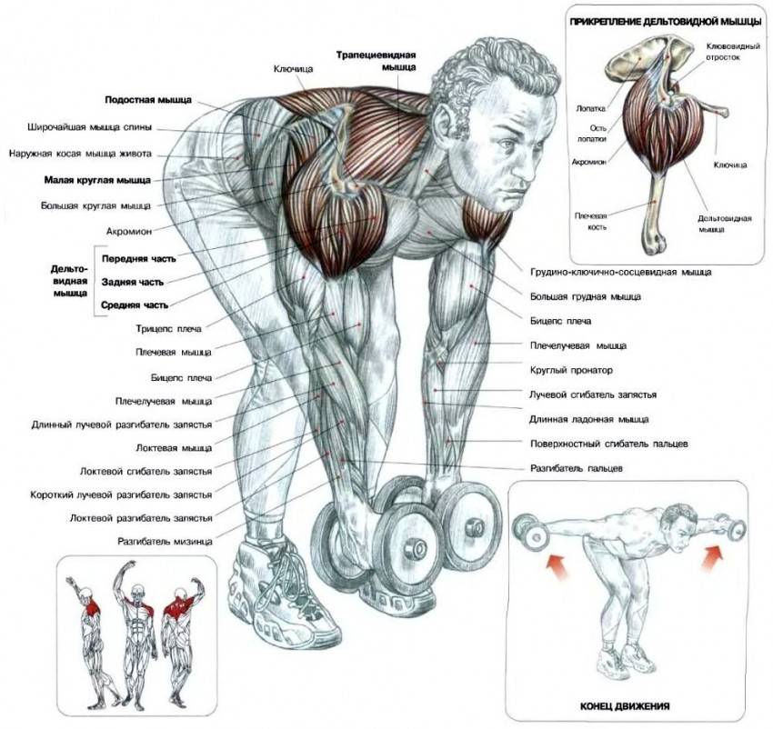 Это упражнения с гантелями для укрепления мышц спины часто включают в тренинг программу, несмотря на то, что его основная цель – прокачка заднего пучка дельт. Он работаете совместно с другими мышцами спины, потому разведение можно включать как в день плеч, так и спины.