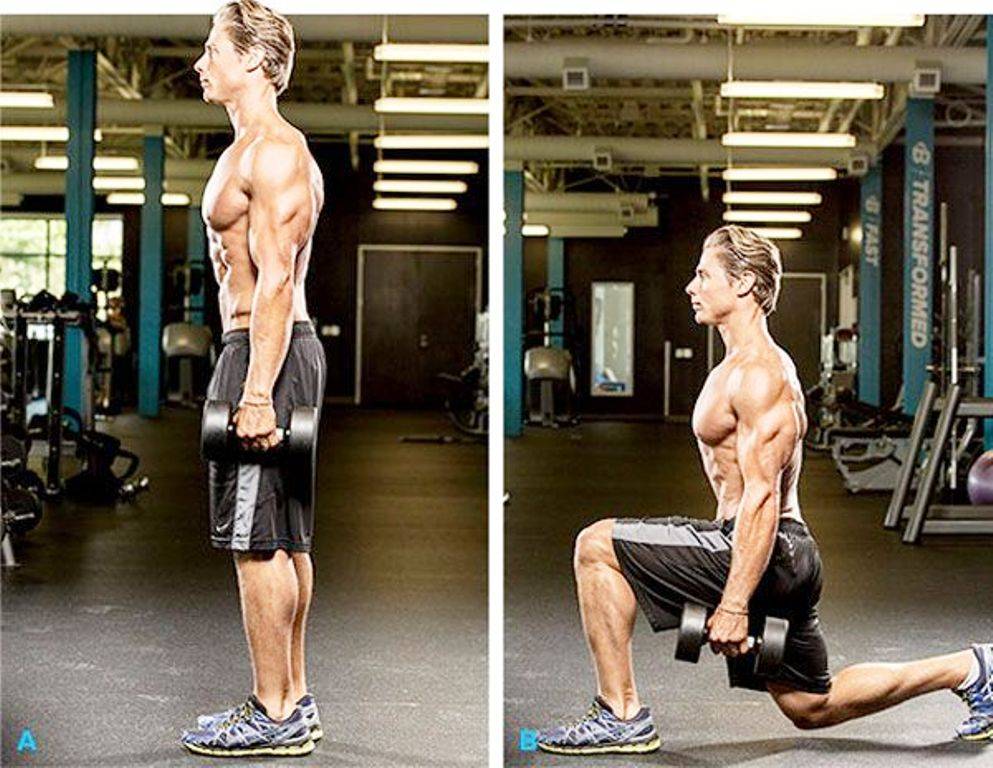 Обычные выпады для ягодиц. Чем шире шаг задней ноги — тем больше будут работать ягодицы и бицепсы бедер Чем короче шаг — тем больше будет работать передняя часть бедра (квадрицепсы).