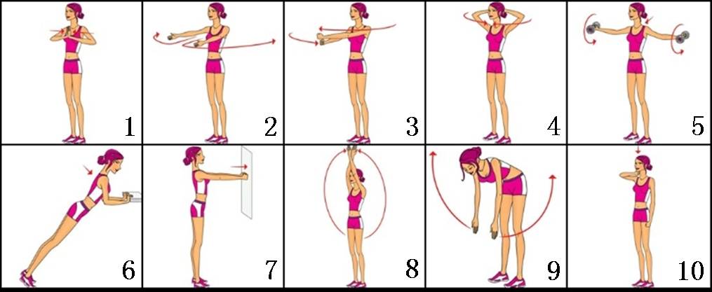 - Кисти рук — к плечам. Делают локтями круговые движения вперед-назад. Повторить 20 раз.