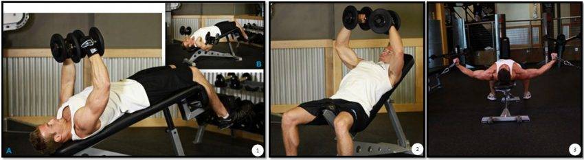 Чаще всего сначала идет разведение рук с гантелями на горизонтальной скамье, затем разведение гантелей лежа на наклонной скамье. Если вы хотите в один день сделать 3 разводки под разными углами – сбавьте количество подходов с 4 до 3, или даже до двух. Не забудьте, разведение гантелей на скамье требует разминочного подхода.