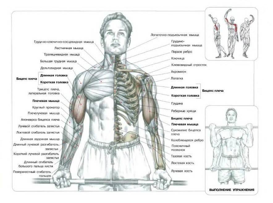 Основным упражнением является подъём прямой штанги на бицепс. Целевая мышца, конечно же, бицепс. Но в работе участвуют также брахиалис (плечевая) и брахирадиалис (плече-лучевая) мышцы. Стабилизирующие мышцы – сгибатели запястья, трапециевидные мышцы (средняя и верхняя часть), передняя часть дельтовидной мышцы и мышца, поднимающая лопатку – леватор.