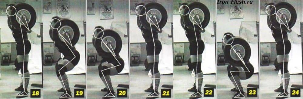 Далее переходим непосредственно к приседанию со штангой над головой: