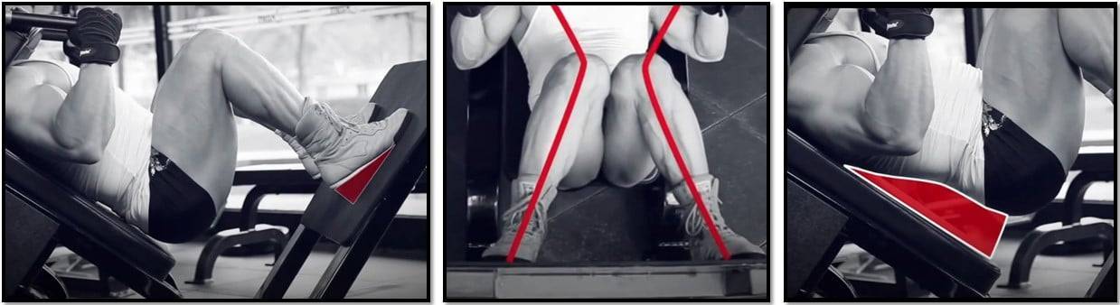 В первую очередь упражнение задействует верхнюю и нижнюю область бедра, но прокачивать им можно все мышцы ног, даже икры и ягодицы. Допустим выполнять упражнение с широко расставленными ногами – вы задействуете в работу бицепс бедра. Если – же выполнение происходит с нормальной постановкой ног – хорошо прорабатывается верхняя часть бедра. Для прокачки икр – поднимайте платформу только ступнями. А для прокачки ягодиц – располагайте ноги как можно выше. Также для усиления нагрузки на ягодичную мышцу – спускайте ноги очень низко, если же вы выполняете движение с малой амплитудой – то вся нагрузка перейдет на бедра.