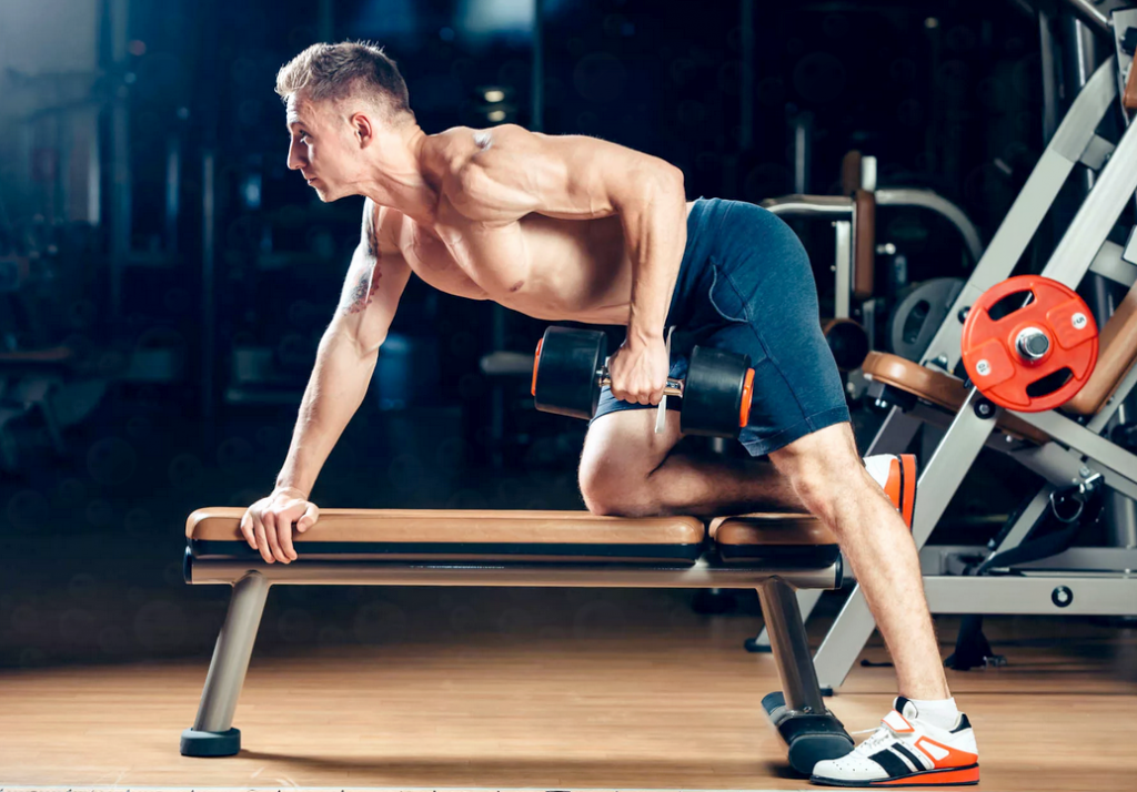 Обопритесь на скамью рукой и коленом, выпрямите спину и возьмите гантель в свободную руку. Она должна свободно свисать с боковой стороны скамьи. Согните руку в локте. Далее: