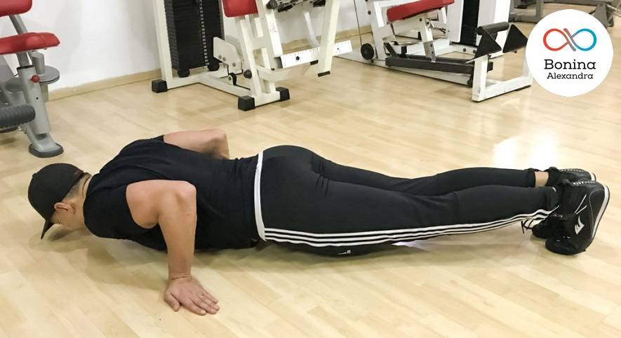 Начинать лучше всего тогда, когда руки согнуты и вы лежите грудью на них. Тело лежит как прямая линия, нагрузка должна распределяться между руками и ногами.