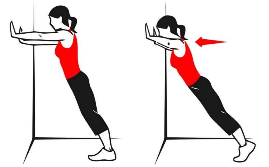 - Встаем напротив стенки на расстоянии примерно одного метра и упираемся на вытянутые руки, на уровне плеч.