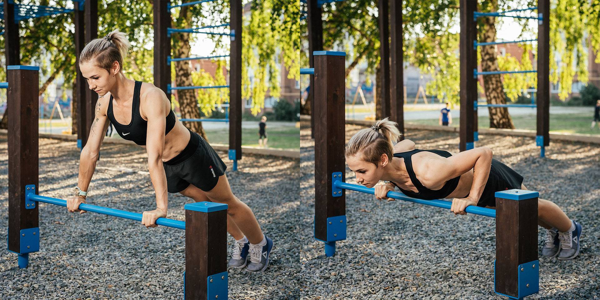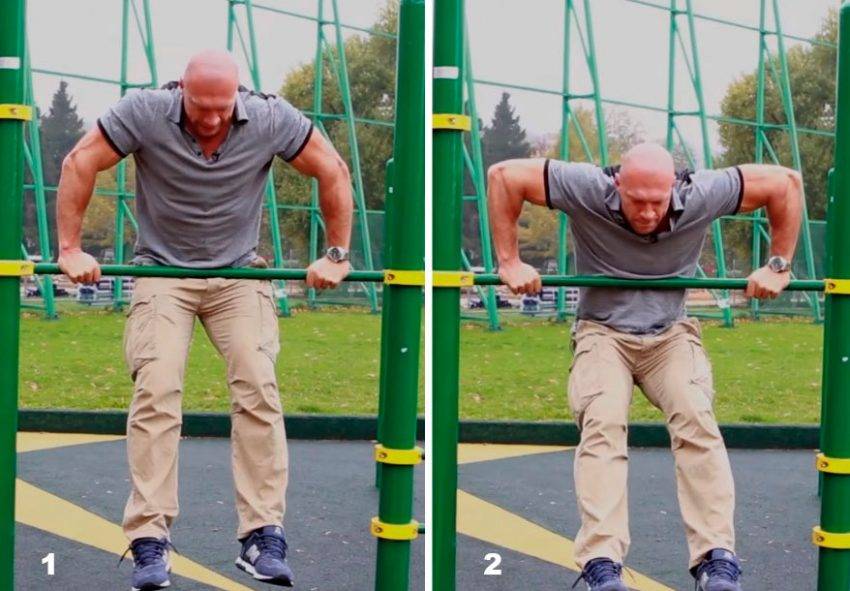 На перекладинах и брусьях можно делать отжимания. Упражнение задействует грудные мышцы, передние дельты и трицепс. Многие тренеры рекомендуют совмещать отжимания на брусьях вместе с подтягиваниями, чтобы по максимуму прорабатывать весь торс. Можно выполнять следующие действия: