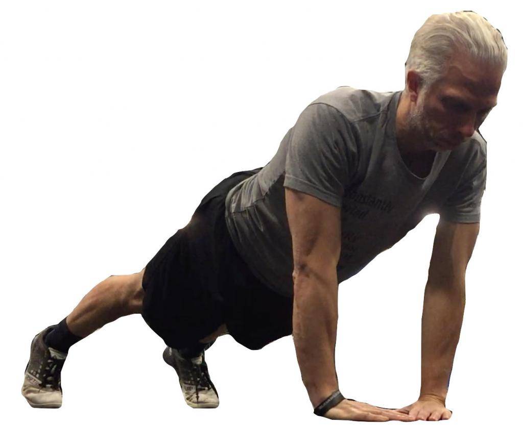 Исходное положение — руки вытянуты перед собой, мышцы пресса, корпуса и ног напряжены, вес тела распределен равномерно. На вдохе медленно опуститесь вниз, не выгибая головы и следя за тем, чтобы живот был немного втянут. На выдохе вернитесь в исходное положение, ощущая работу мышц груди.