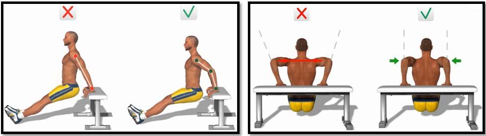 - Типичные ошибки при выполнении обратных отжиманий от скамьи.