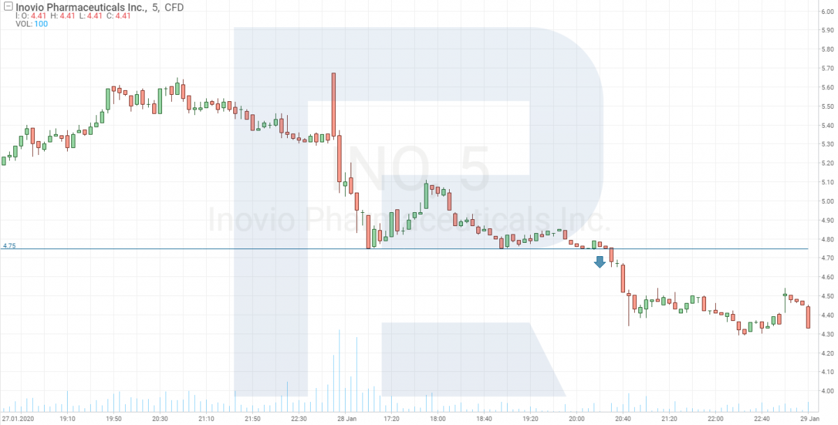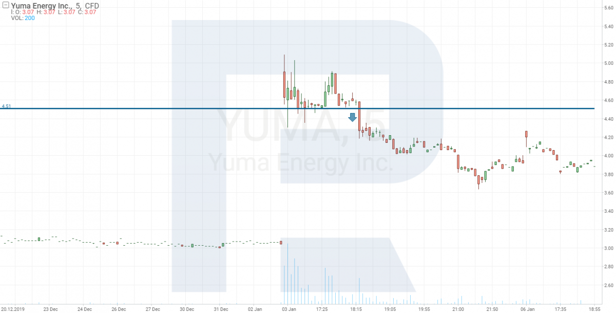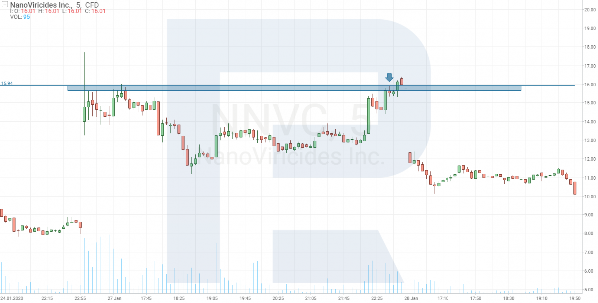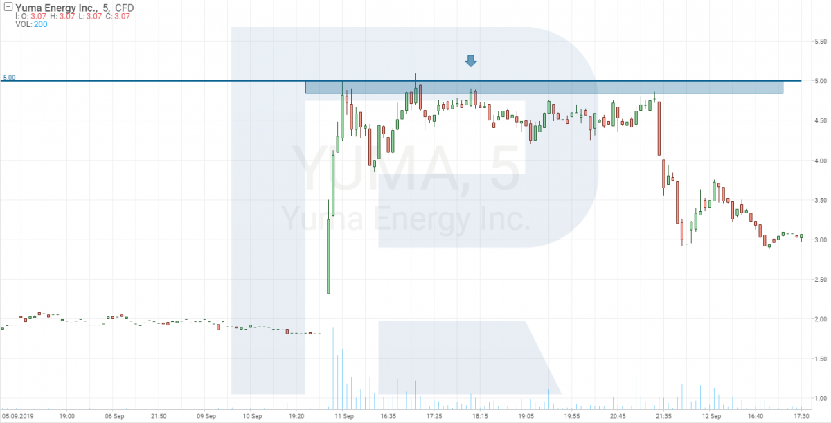 После того, как сделали отбор акций, переходим в платформу R Trader и начинаем наблюдать за графиком бумаги на периоде M5. Цель – найти момент, когда покупатели или продавцы начнут формировать уровень, от которого в последующем можно заходить в позицию. В нашем случае есть два варианта входа в позицию. Первый предполагает пробой поддержки, образованной покупателями.