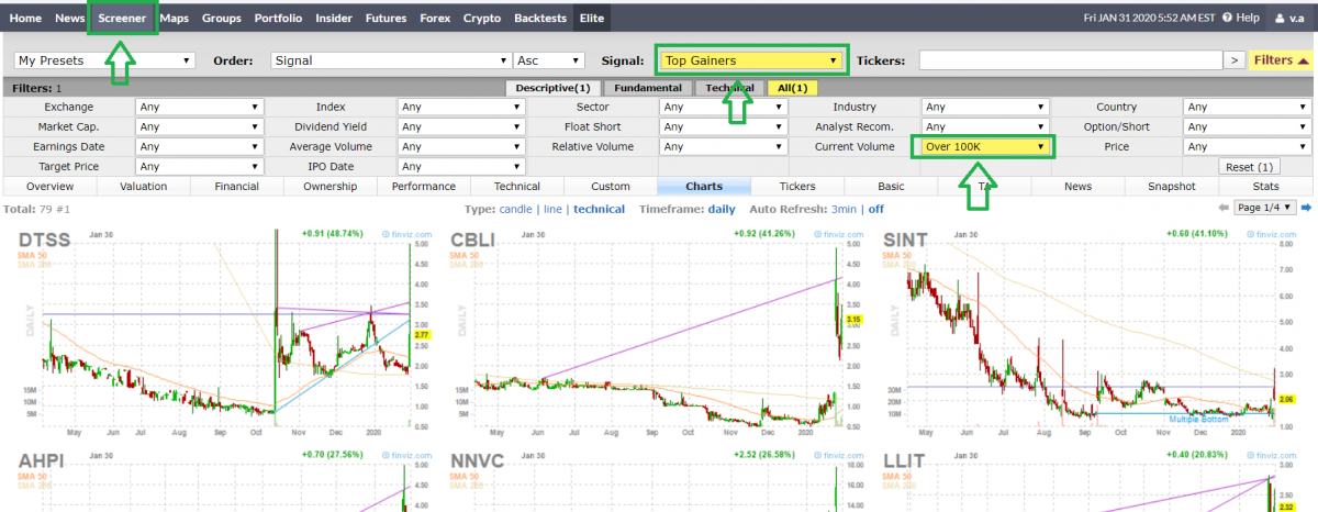 В настройках поиска в графе Signal выбираем Top Gainers (лидеры роста), в графе Current Volume выбираем Over 100K (текущий объем торговли акциями за сессию).