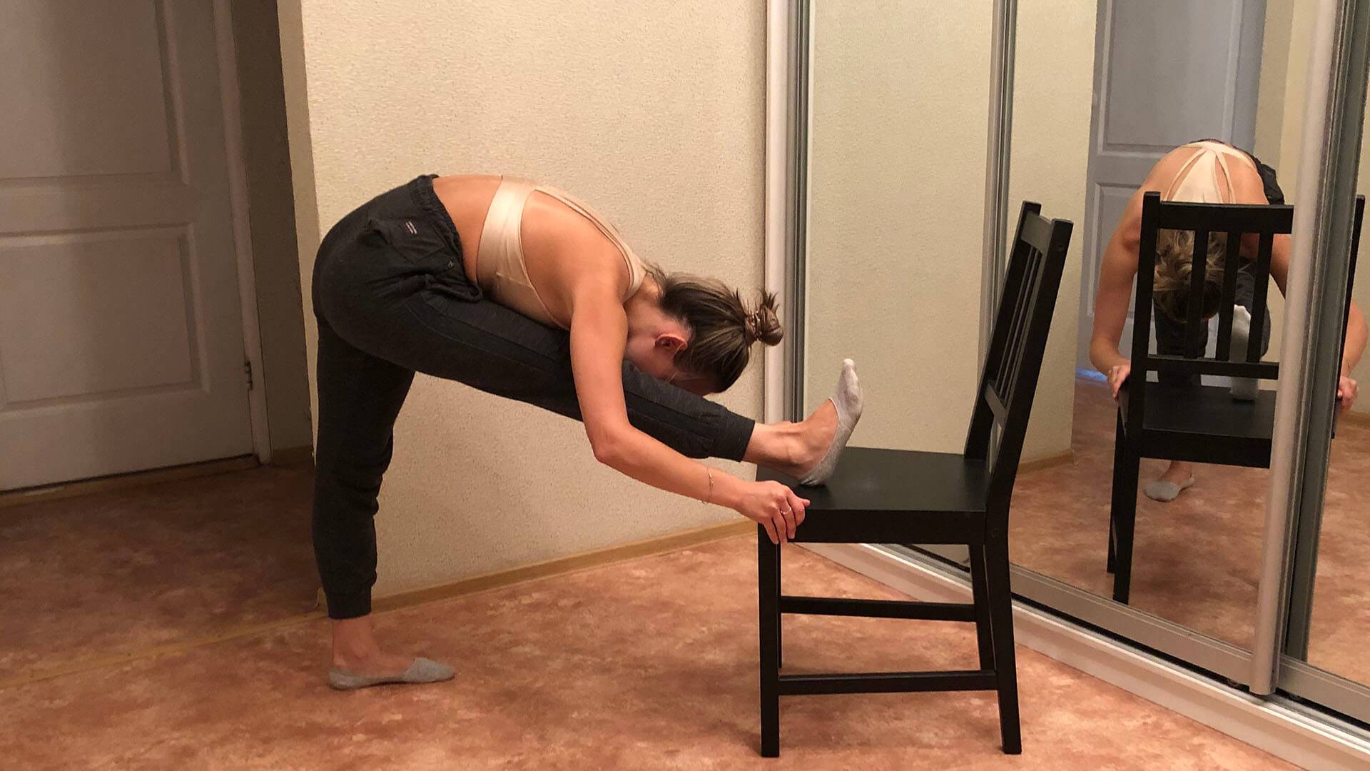 - Взявшись одной рукой за спинку стула или другую надёжную опору, одну ногу необходимо согнуть так, чтобы пятка упиралась в таз. Ногу следует придерживать свободной рукой, чтобы продержаться в этой позиции 30 секунд.