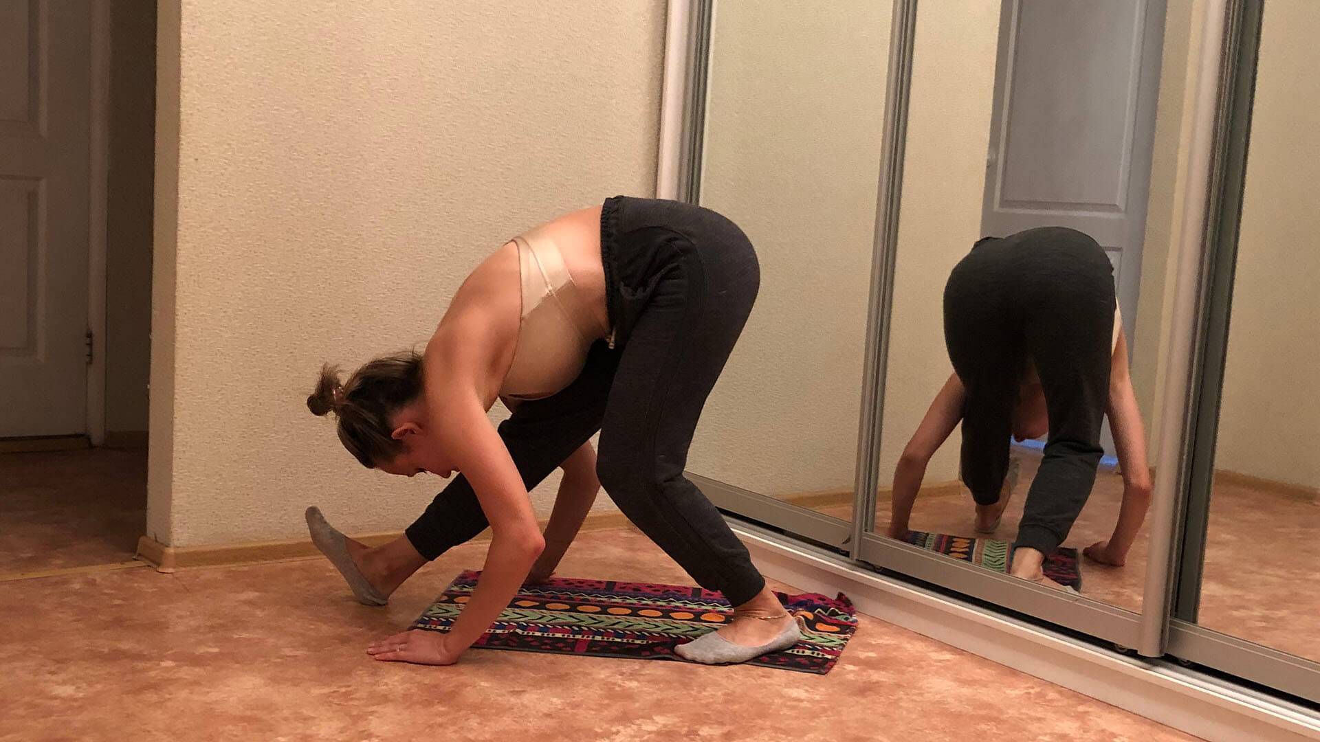 - Боковой выпад. Чуть согнув колени, левой ногой необходимо шагнуть вбок, при этом правая нога выпрямляется, а пальцы правой руки должны коснуться левой ноги — настолько низко, насколько позволяет растяжка.