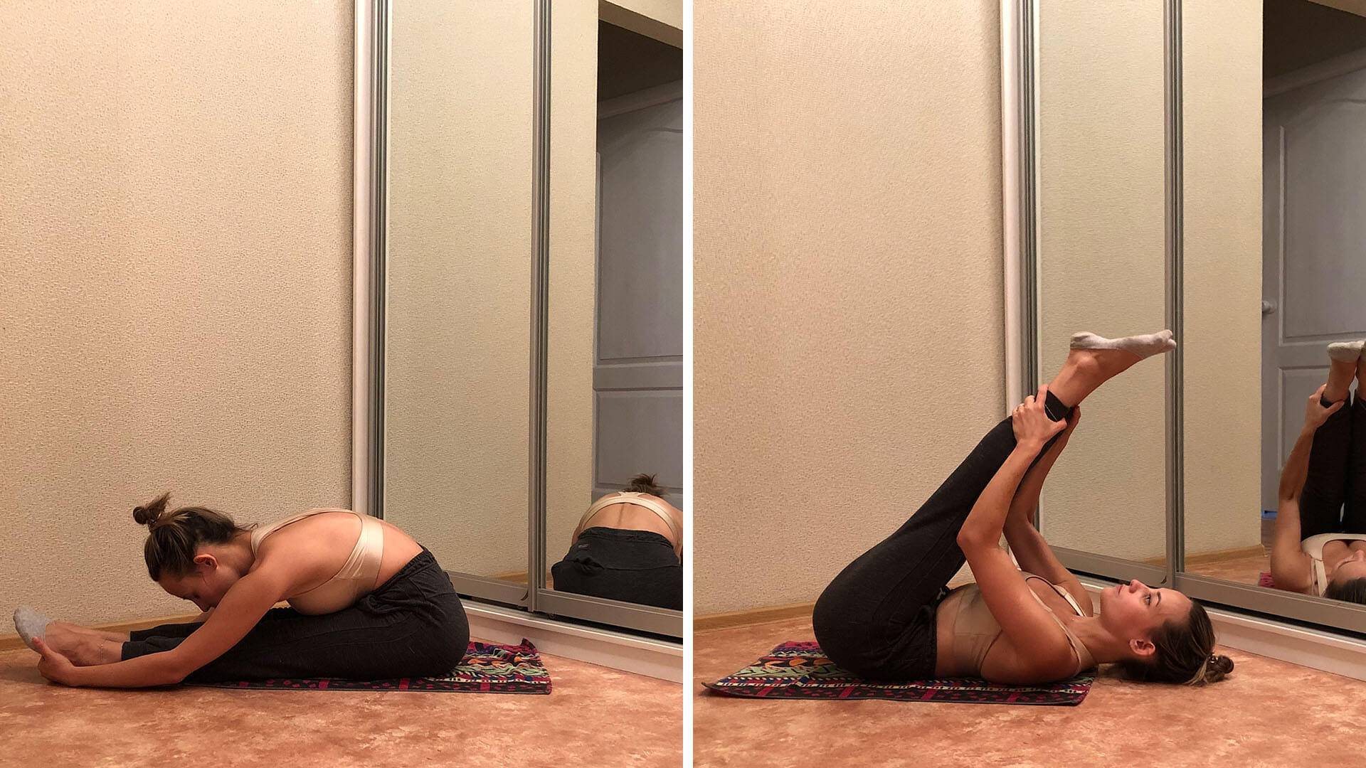 - Из положения лежа на спине тяните ноги в стороны не сгибайте колени.