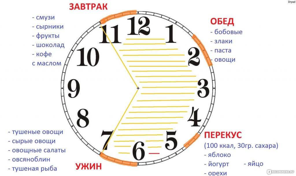 - 16/8 — чередование 16 часов голодания и 8 часов для приема пищи. Подразумевает ранний ужин и отказ от завтрака. Пища может употребляться с полудня до восьми часов вечера, в остальное время допустимы только напитки.