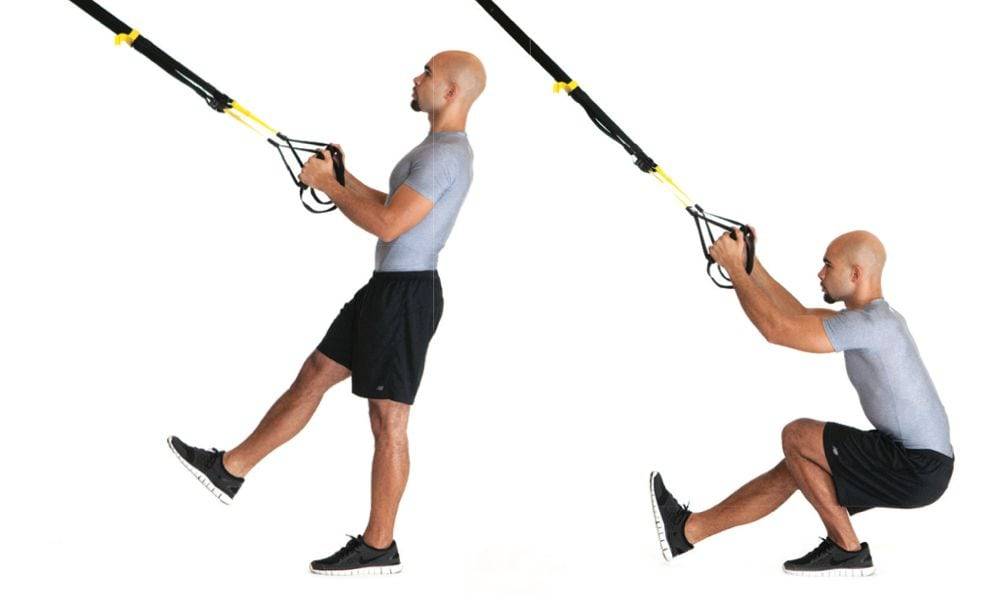 Оно же – приседания с вытянутой вперед ногой. Встаньте прямо, держась за ремни руками, выпрямите ногу вперед, и приседайте на другой. Выпрямленная нога не должна касаться земли в глубоком приседе. Это упражнение на ноги прорабатывает бицепс бедра, квадрицепс, ягодичные мускулы и стабилизаторы.